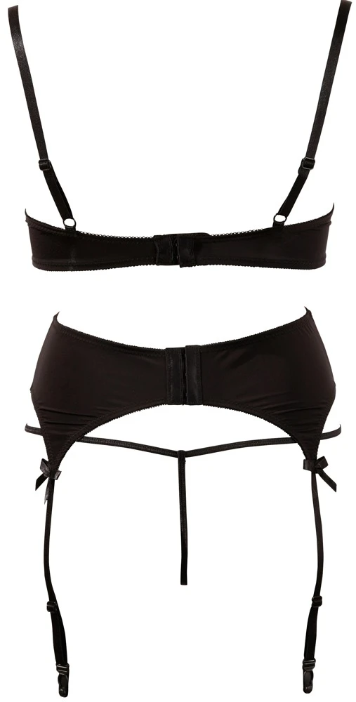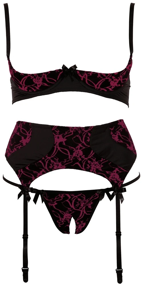 Dieses Set besticht durch sein wunderschönes Farbenspiel und bringt Deine Kurven aufregend zur Geltung! Schwarzes Set mit beerenfarbenem Flockprint und Schleifchenverzierung. Bügel-Hebe mit leicht gefütterten Cups, Hakenverschluss hinten und verstellbaren Trägern. Strapsgürtel mit Hakenverschluss hinten und verstellbaren Strapsen. Dazu passender String mit offenem Schritt.