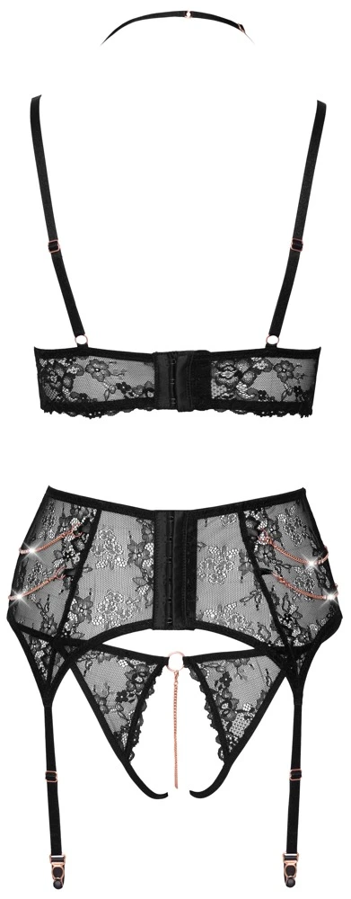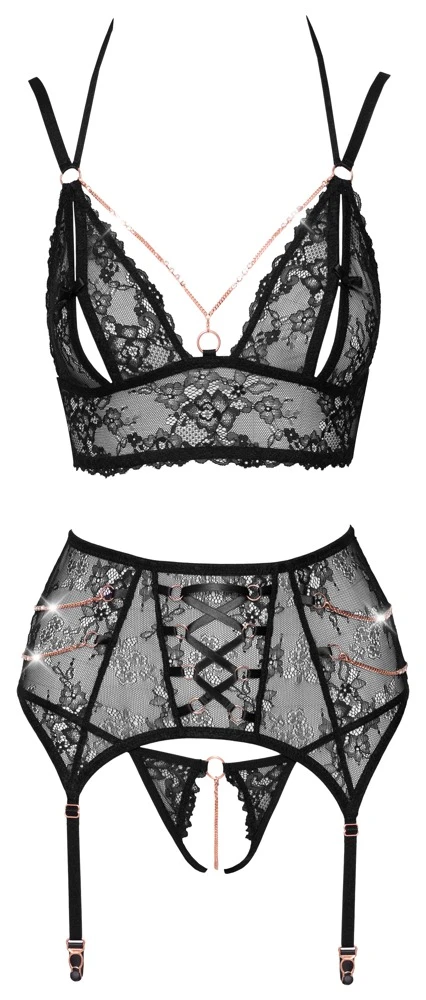 Dieses 3-teilige Set ist aus feiner schwarzer Stretchspitze gefertigt und aufwendig mit roségoldfarbenen Elementen und mit Strass verzierten Kettchen geschmückt. Dazu bietet es raffinierte Details, wie die verführerisch geschlitzten Cups des Bralettes und die stimulierende Schrittkette des Slip ouverts, die du auch abnehmen kannst. Das Set sieht nicht nur großartig aus, es trägt sich auch genauso, sodass nicht zwickt und kneift bei deinem Verführauftritt.