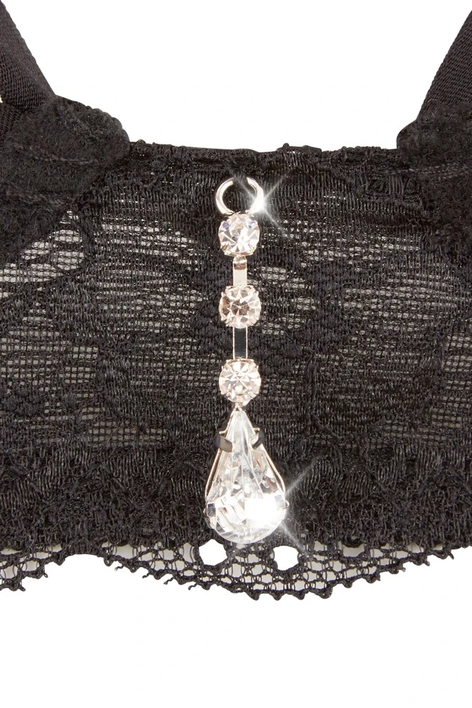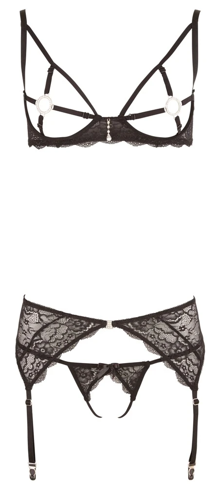 Dieses Strapsset aus Spitze setzt all Deine Vorsätze gekonnt Szene! Der Bügel-BH mit edlen Strass-Steinchen vorne verzaubert mit freigelegtem Busen, der lediglich von einem individuell anpassbaren Strass-Ring um die Nippel geschmückt wird. Während der Strapsgürtel mit funkelndem Strass-Öffner begeistert, lockt der String mit komplett offenem Schritt! BH und Strapsgürtel mit Hakenverschluss im Rücken. Träger, Strapshalter und Cup-Riemchen sind verstellbar für Deinen ultimativen Komfort!