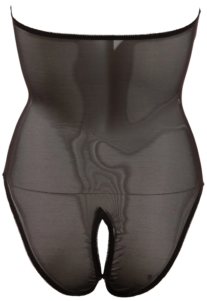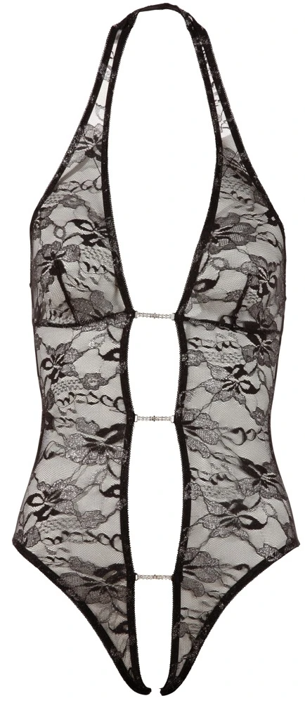 Mit diesem Neckholder-Body aus zarter schwarzer Spitze und den silberfarbenen Glitzer-Details bringen Sie Ihre Weiblichkeit aufregend zur Geltung. Der figurschmeichelnde Body ist vorne offen und ist mit drei Strasskettchen verbunden. Hinten schwarz-transparentes Powernet für erregende Einblicke. Im Schritt einladend ouvert.