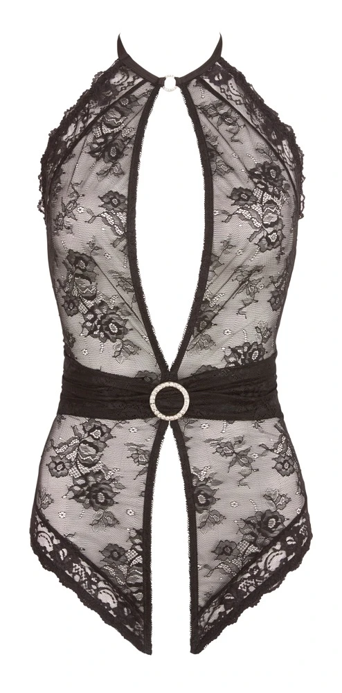 Der erotische Einteiler ist vorne bis runter durch den Schritt einladend offen und wird nur mithilfe des Strass-Rings am Hals sowie der Strass-Schnalle an der Taille zusammengehalten.