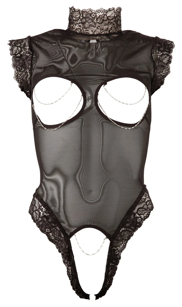 • Schnitt & Material: Transparenter Body mit Spitzenbesatz an den Armen, dem Halsband (2 Knöpfe hinten) und den Beinausschnitten. Busen und Scham sind offen und mit abnehmbaren Kettchen verziert. 90% Polyamid, 10% Elasthan.