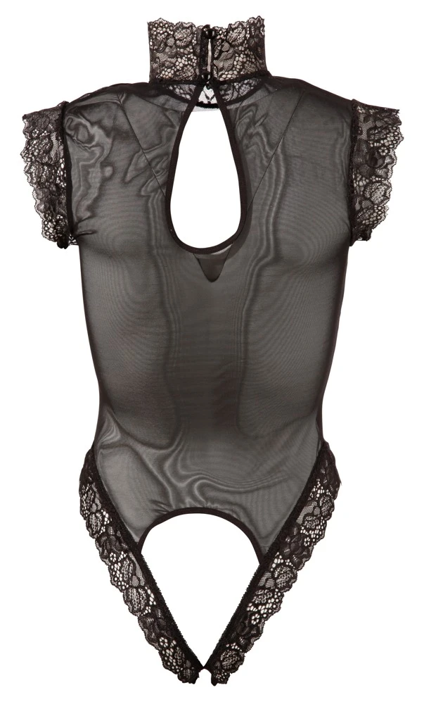 Dieser leicht transparente Body ist offen für vieles… Mit Spitze am kurzen Arm, Hals- und Beinausschnitt sowie am Halsband, welches hinten mit zwei keinen Knöpfen zu schließen ist. Busen und Scham sind offen und mit abnehmbaren Kettchen verziert.
