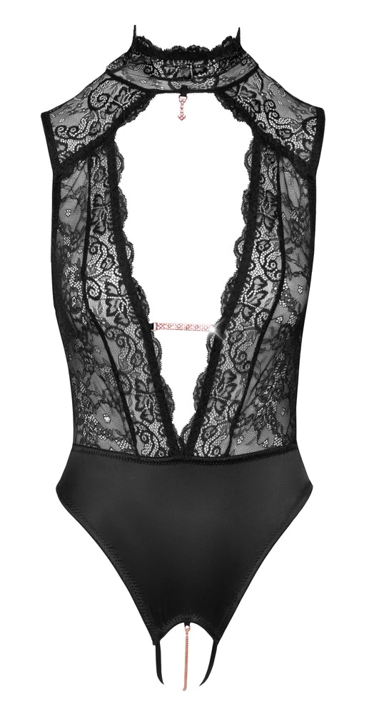 • Schnitt & Material: Body in Zweiteiler-Optik aus feiner weicher Spitze und edlem Stretchsatin. Mit hohem Stehkragen zum Knöpfen. Vorne und hinten großer Ausschnitt, vorne mit Strasskette. Kleiner Strassanhänger am Kragen vorne. Komplett schrittoffener String mit stimulierendem Kettchen (abnehmbar). Spitze 90% Polyamid, 10% Elasthan; Stretchsatin 94% Polyester, 6% Elasthan.
