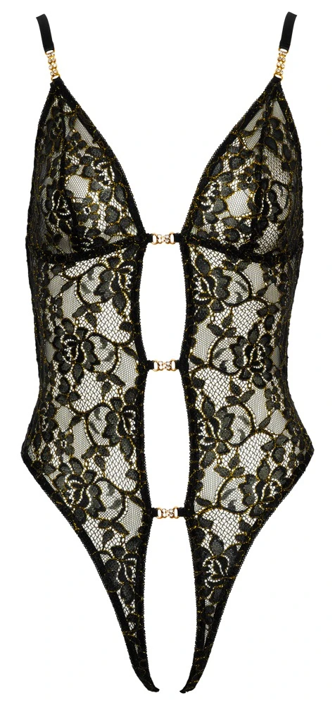 âą Schnitt & Material: Hautnaher Stringbody aus schwarzer BlĂŒtenspitze mit eingewebten goldfarbenen MetallicfĂ€den und goldfarbenen Details. Komplett offene Front wird durch 3 dekorative Glitzerstege fest zusammengehalten. TrĂ€ger vorne mit Glitzerelementen. 95% Polyamid, 5% Metall.