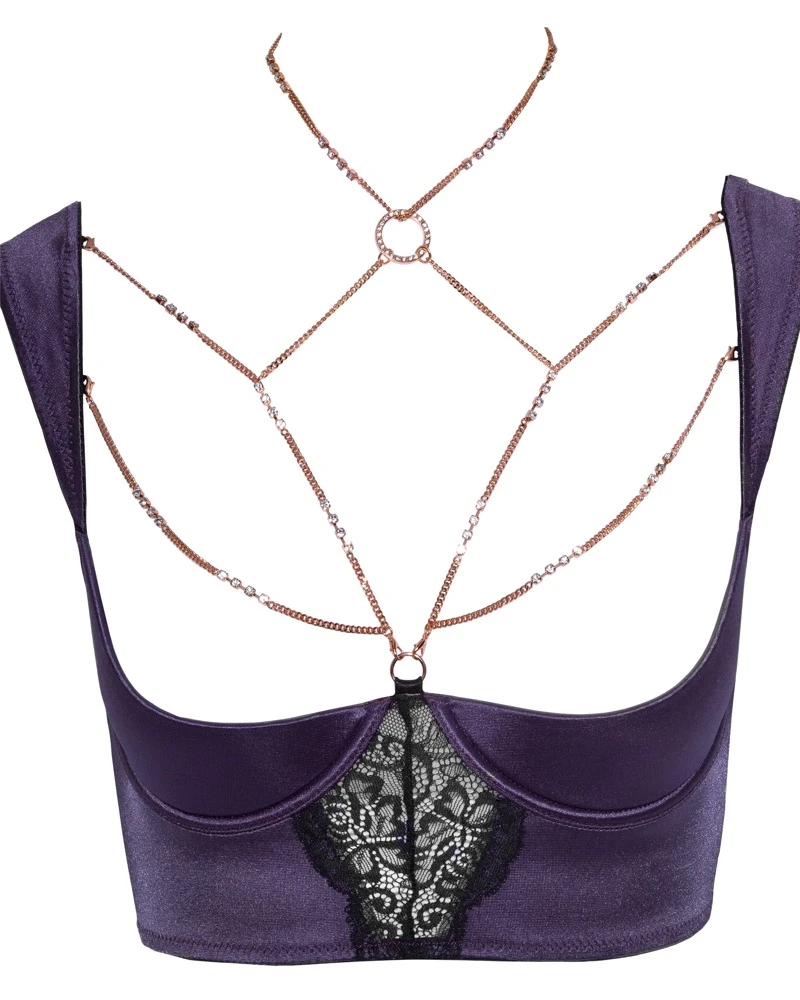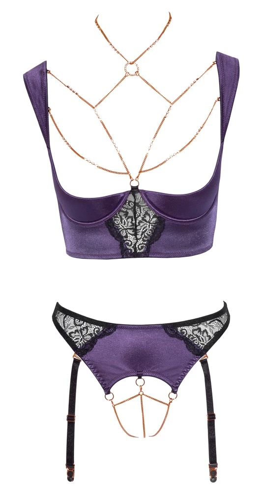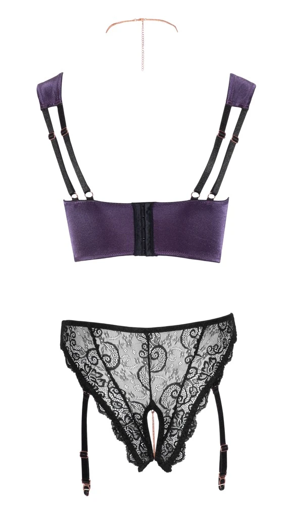 • Schnitt & Material: Longline-Hebe und Straps-Slip ouvert aus elastischem violettfarbenem Satin mit schwarzen Spitzeneinsätzen, garniert mit roségoldfarbenen strassbesetzten Ketten. Bügel-Hebe mit leicht gepolsterten Cups. Die Ketten sowie das Halsband sind von der Hebe abnehmbar. Die breiten Träger verlaufen im Rücken als 4-fach-Träger und sind verstellbar. Der Straps-Slip ist vorne im Materialmix und hinten komplett aus Spitze gearbeitet. Durch den offenen Schritt führen drei stimulierende Schrittketten, die ebenfalls abnehmbar sind, genauso wie die verstellbaren Strumpfhalter. 90% Polyamid, 10% Elasthan. Ohne Strümpfe.