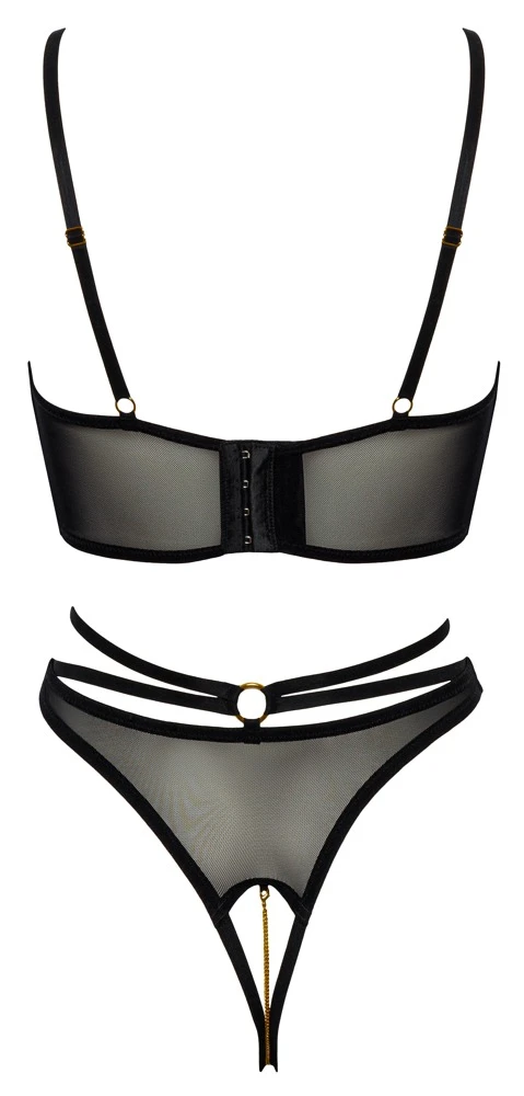 • Schnitt & Material: Longline-Hebe und Riostring ouvert im Set. Schwarz mit goldfarbenen Details. Vorne Blütenspitze mit eingewebten Metallicfäden, hinten Powernet. Länger geschnittene Hebe mit leicht gepolsterten Bügel-Cups. Stretchriemchen im Dekolleté, Neckholder und Träger sind verstellbar. Riostring mit Taillen-Stretchbändern und abnehmbarer, stimulierender Kette im offenem Schritt. Spitze 95% Polyamid, 5% Metall; Powernet 90% Polyamid, 10% Elasthan.