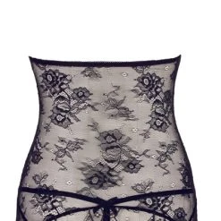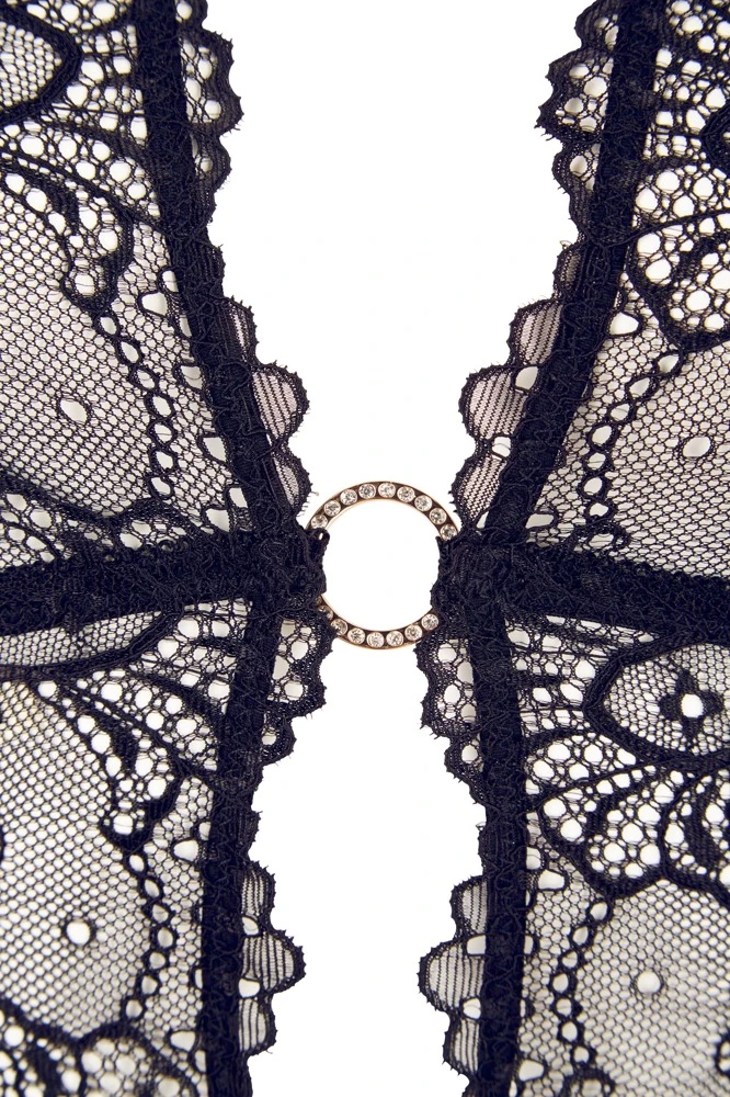 Das schwarze Strapshemd mit Neckholder ist komplett aus raffinierter Spitze gearbeitet und verzaubert mit einer durchgehend offenen Front, die nur von vier mit Strass besetzten goldfarbenen Ringen zusammengehalten wird. Das weiche Material bietet einen hohen Tragekomfort und die vier am Spitzensaum befindlichen Strapshalter sind in der Länge verstellbar. Der passende String lockt mit einem einladend offenen Schritt.