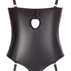Der schwarze Stringbody mit Hebe und abnehmbaren Strapsen bringt Deine weiblichen Rundungen gekonnt zur Geltung. Zarte Riemchen-Details, akzentuiert mit edlen Strass-Elementen umrahmen sinnlich Deinen Busen und den komplett offenen Schritt. Der semitransparente Spitzeneinsatz in der Front wird mit einer raffinierten Schnürung komplementiert.