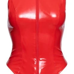 • Schnitt & Material: Body komplett im knallroten Lackglanz. Figurnahe Schnittführung mit hohen Beinausschnitten. Vorne unterlegter 2-Wege-Reißverschluss vom Stehkragen durch den Schritt bis über den Po. 100% Polyester, Polyurethan-Beschichtung.