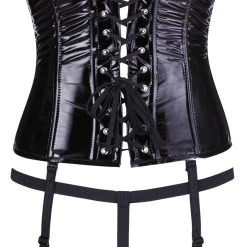 • Schnitt & Material: Trägerlose Vollbrust-Corsage plus String komplett im schwarzen Lackglanz. Corsage mit eingearbeiteten Formstäben, vorne durchgehender Reißverschluss, im Rücken variable Schnürung. Strumpfhalter verstell- und auch ganz abnehmbar. 100% Polyester, Polyurethan-Beschichtung.