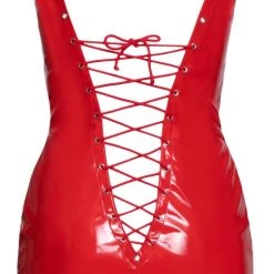• Schnitt & Material: Kurzes ärmelloses Kleid komplett im roten Lackglanz. In enger Schnittführung mit Brustabnähern für perfekten Sitz. Vorne und hinten extra tief ausgeschnitten und sexy geschnürt. 100% Polyester, Polyurethan-Beschichtung.