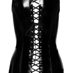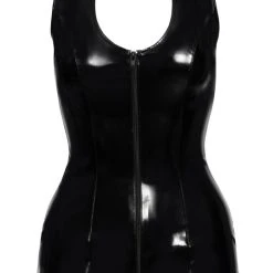 • Schnitt & Material: Kurzes, ärmelloses Kleid komplett im schwarzen Lackglanz. In figurnaher Schnittführung mit schönem tiefem Dekolleté und kleinem Stehkragen. Vorne 2-Wege-Reißverschluss, hinten mittig komplett durchgehende Schnürung. 100% Polyester, Polyurethan-Beschichtung.