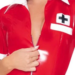 • Schnitt & Material: Kurzes Halbarm-Kleid plus Haube im Krankenschwester-Look komplett im rot/weißen Lackglanz mit schwarzem Kreuz-Emblem. Enge Schnittführung mit durchgehendem Reißverschluss vorne. Weiße Lack-Haube mit Kreuz-Emblem zum Binden. 100% Polyester, Polyurethan-Beschichtung.