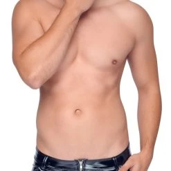 Diese Pants im schwarzen Lackglanz kommt in fantastisch elastischer Qualität daher, die sich hautgenau anschmiegt und für ein sehr komfortables Trage- und Bewegungsgefühl sorgt. Lässig sind die beiden seitlichen Eingrifftaschen, in denen auch kleine Helferlein ihren Platz finden können. Vorne ist ein markanter Metall-Reißverschluss eingenäht, der sich sowohl für praktische als auch erotische Zwecke schnell öffnen lässt. Der Reißverschluss ist unterlegt, sodass keine Haut oder Härchen beim Öffnen und Schließen mit eingeklemmt werden.
