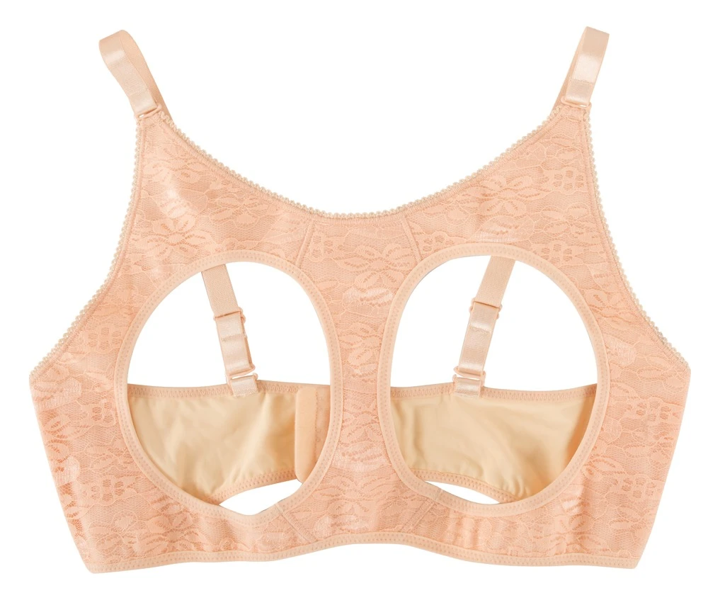 • Schnitt & Material: Hautfarbener BH mit einsetzbaren Silikonbrüsten. Lebensechte Optik und Haptik. Silikonbrüste auf der Innenseite leicht vertieft. Kann von Männern und Frauen mit kleiner Oberweite getragen werden kann. Träger verstellbar und abnehmbar. Befestigung der Brüste mit Klettverschluss. Gewicht pro Brust 1000 g. Umfang 75-85 cm. BH 90% Polyester, 10% Elasthan; Brüste Silikon.