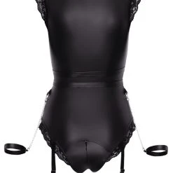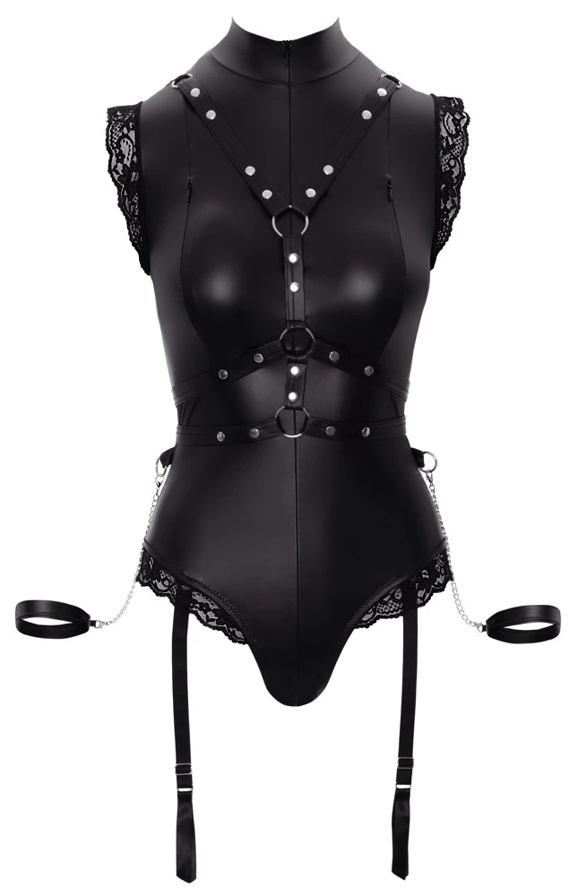 • Schnitt & Material: Straps-Body im elastischen Mattlook mit zarter Spitze an Arm- und Beinausschnitten. Der nietenbesetzte Riemen-Harness mit Handfesseln an Ketten jeweils seitlich ist komplett abnehmbar. Verstellbare Strapse ebenfalls abnehmbar. Verdeckter Reißverschluss vom Stehkragen bis über den Po sowie verdeckte Reißverschlüsse über den Brüsten. 90% Polyester, 10% Elasthan.