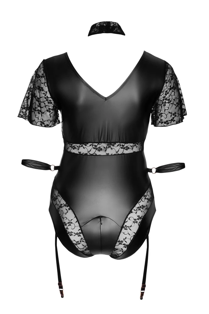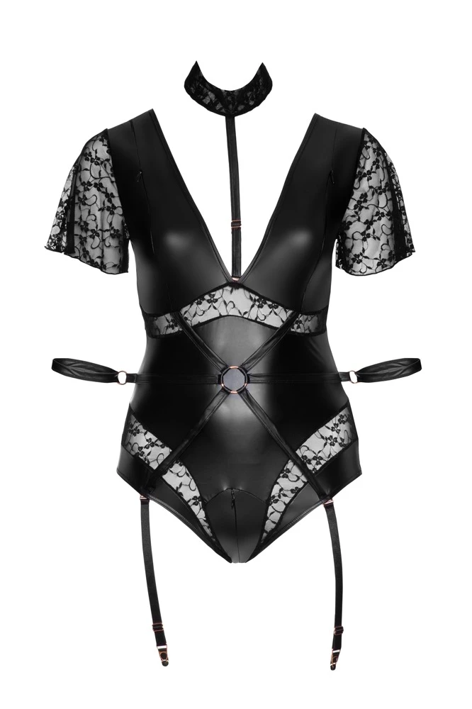 Dieser Kurzarmbody besticht mit dem tiefen Ausschnitt und den vielen abnehm- und verstellbaren Elementen, wie Strapse, Halsband und Armfesseln an den Seiten. Diese Fesseln machen diesen elegantverruchten Body zu mehr als nur einem Kleidungsstück und ermöglichen softe Bondage-Spielchen! Der 2-Wege-Reißverschluss im Schritt ermöglicht zudem Sex, ohne dass Du dieses schöne Stück vorher ausziehen musst.