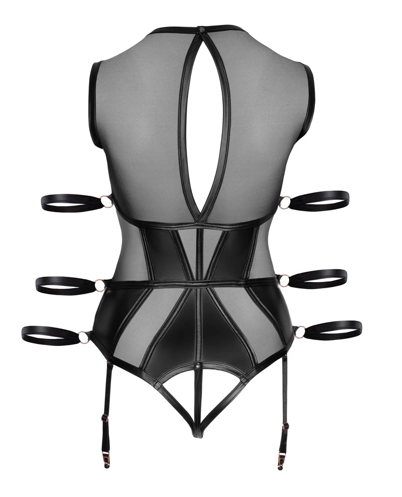 • Schnitt & Material: Straps-Body im elastischen Mattlook mit feinem Powernet. Stringteil mit Druckknöpfen komplett abnehmbar. Über den Brüsten mit Druckknöpfen zum Öffnen. Jeweils seitlich 3 Armfesseln mit Klettverschluss. Die Strapse sind verstell- und abnehmbar. 90% Polyester, 10% Elasthan; Spitze 90% Polyamid, 10% Elasthan.
