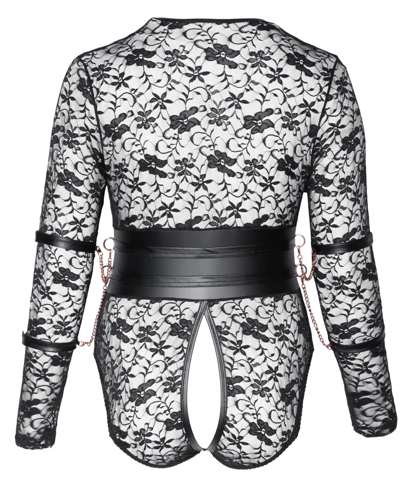 • Schnitt & Material: Langarm-Body aus weicher elastischer Spitze mit Mattlook-Einsatz rundum die Taille und roségoldfarbenen Elementen. Inklusive vier Armfesseln, die mit ihren Karabinerketten an den seitlichen Ringen des Tailleneinsatzes befestigt werden können. Der Body ist in der Front, durch den Schritt und bis über den Po komplett offen und wird vorne nur von zwei Ringen zusammengehalten. Verstellbare Strapse vom Slip-Teil abnehmbar. 90% Polyamid, 10% Elasthan; Tailleneinsatz 90% Polyester, 10% Elasthan.