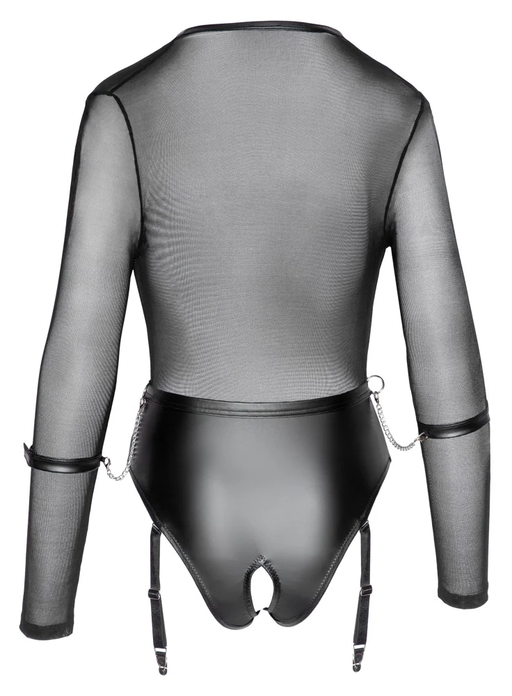 Dieser Body ist dein perfekter Spielanzug für fesselnde Momente! Obenrum punktest du mit einer atemberaubend tief dekolletierten Transparenz und untenrum glänzt du im trendigen schwarzen Mattlook. Dazu ist der Schritt (für spontane Aktionen) komplett geöffnet und du kannst dich mit den beiliegenden Handfesseln auch noch lustvoll fixieren lassen. Trage den Body mit den verstellbaren Strapsen und sexy Strümpfen (nicht beiliegend) – oder nimm die Strumpfhalter ab und genieße deinen fesselnden Auftritt nur im Body.