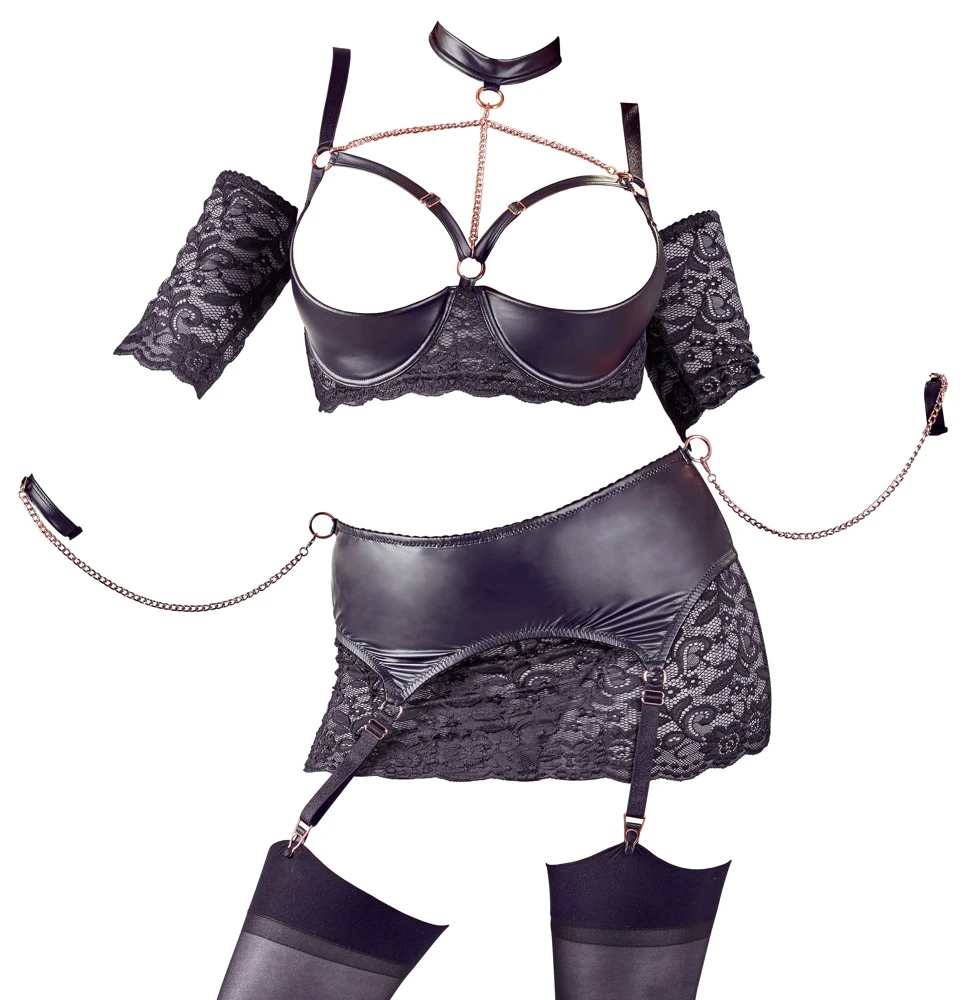Mit diesem aufregenden Set, bestehend aus Bügel-Hebe, Strapsgurt, Armstulpen und Handfesseln, gibst Du Deinem Verführ-Auftritt eine fesselnde Note! Das Set kommt in weicher, elatischer Spitze daher und ist trendy kombiniert mit edlem Mattlook und roségoldfarbenen Details. Die leicht gefütterte Bügel-Hebe rückt mit ihren verstellbaren Riemen über dem Dekolleté sowie dem schillernden Kettchengeschirr Deine Brüste direkt ins Blickfeld. Das Kettchengeschirr sowie das Klettverschluss-Halsband kannst Du aber auch komplett abnehmen. Das Halsband mit dem Ring vorne kannst Du auch solo tragen. Jeweils seitlich ist am Strapsgurt ein Ring befestigt, in die Du die beiliegenden Handfesseln mit Ketten einhaken kannst. Für den fesselnden Spaß bei Deinen Verführungen!