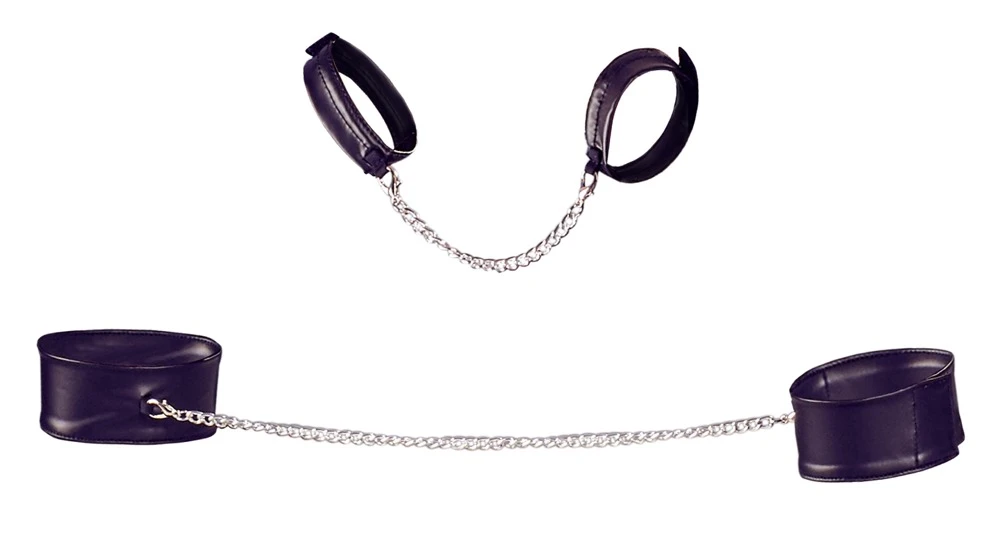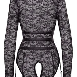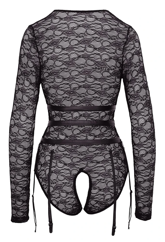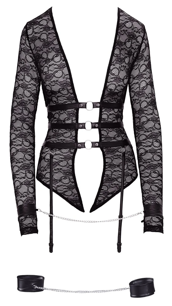 • Schnitt & Material: Body aus Spitze mit 6 Strapsen. Ouvert von Ausschnitt bis zum Steiß und mit 3 Schnallen mit Druckknöpfen auf Taillenhöhe. Mit Bein- und Handfesseln, die mit Klett zu schließen und jeweils mit einem Kettchen an einem Karabinerhaken verbunden sind. Body 90% Polyamid, 10% Elasthan; Fesseln 90% Polyester, 10% Elasthan.