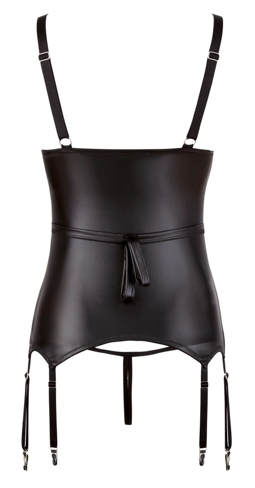 Verstellbare Riemen über dem nackten Busen, ein Riemen um den Bauch sowie Handschlaufen mit Klettverschluss im Rücken. Träger und 6 Strapse verstellbar. Inklusive String ouvert. 90% Polyester, 10% Elasthan. Ohne Strümpfe.