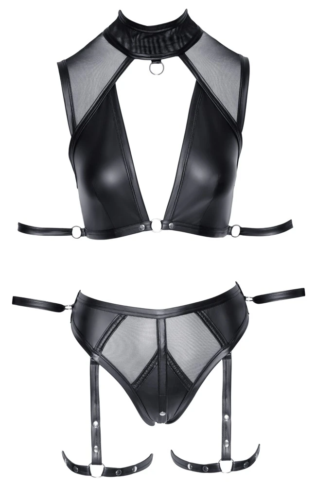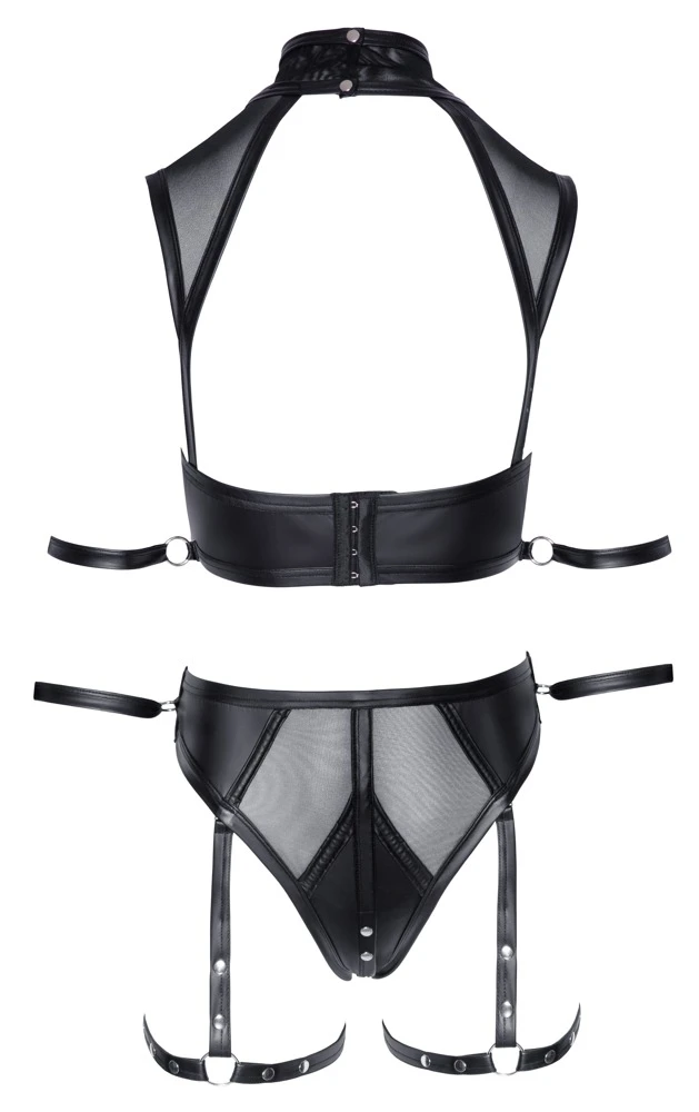 • Schnitt & Material: Top plus Slip im edlen Mattlook mit transparenten Powernet-Einsätzen. Großzügig dekolletiertes Top mit hohem Kragen, der vorne mit einem Ring verziert ist und hinten mit 2 Druckknöpfen geschlossen wird. Nahezu rückenfrei mit breitem Hakenverschluss-Steg. Seitlich jeweils ein Ring mit Fesselriemen für die Arme. Slip taillenhoch geschnitten und im Schritt mit Druckknopfverschluss. Am Taillenbund jeweils seitlich ein Ring mit Fesselriemen für die Hände. Schenkel-Harnesses komplett abnehmbar. Fesselriemen für Arme und Hände jeweils mit verstellbarem Klettverschluss und ebenfalls abnehmbar. 90% Polyester, 10% Elasthan; Powernet: 90% Polyamid, 10% Elasthan.