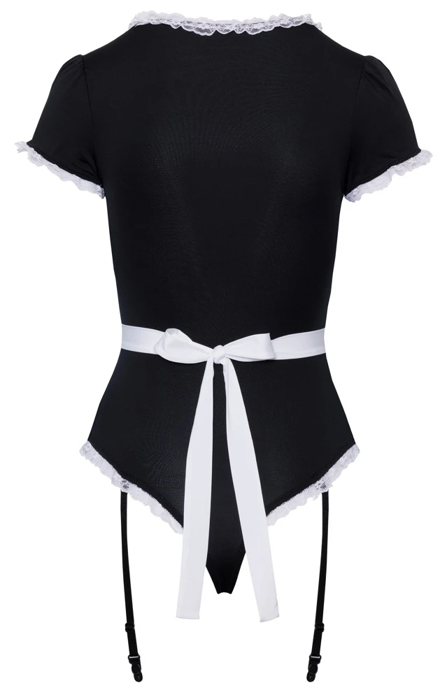 • Schnitt & Material: Straps-Riobody inklusive Schürze als Kellnerinnen-Kostüm. Schwarzer Body mit stilechten weißen Spitzenrüschen am großzügigen Dekolleté, den halben Ärmeln und den hohen Beinausschnitten. 2 kleine weiße Zierknöpfe vorne. Im Schritt mit Druckknopfverschluss. Verstellbare Strumpfhalter abnehmbar. Beiliegende weiße, spitzenverzierte Schürze zum Binden. Body 86% Polyester, 14% Elasthan; Schürze 95% Polyester, 5% Elasthan.