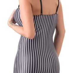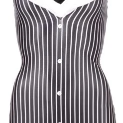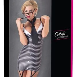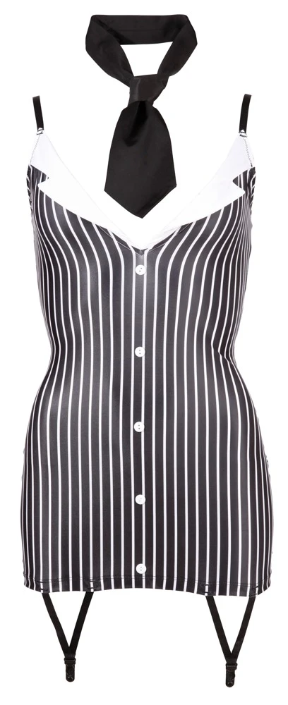 • Schnitt & Material: Enganliegendes Kleid mit verstellbaren Trägern und zwei Strapshaltern vorn. Aufgesetzte Knöpfe vorn und angedeuteter Kragen am tiefen Ausschnitt. Inklusive Krawatte zum Binden. 92% Polyester, 8% Elasthan. Ohne Strümpfe.