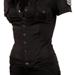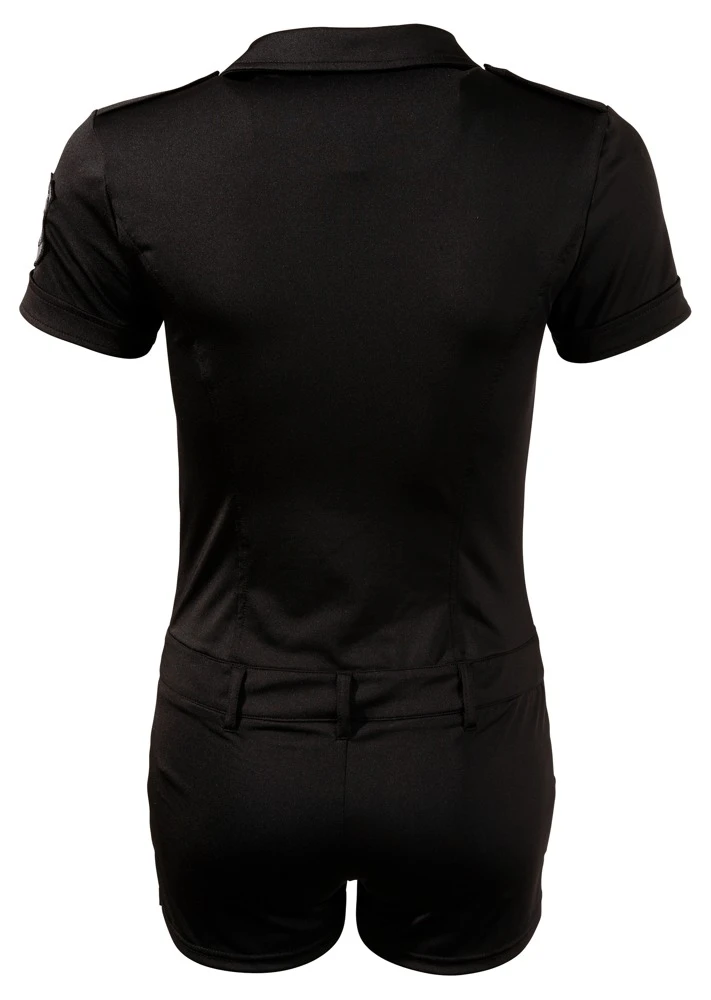 Polizei-Overall mit Special Police-Emblem am linken Arm und zwei aufgesetzten Brusttaschen – beim Anblick einer so sexy gekleideten Politesse wird jeder „Verkehrssünder“ sein Strafmandat gleich bezahlen wollen – am liebsten in „Naturalien“. Nun, die Druckknöpfe vorne sind schnell aufgerissen…