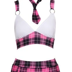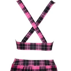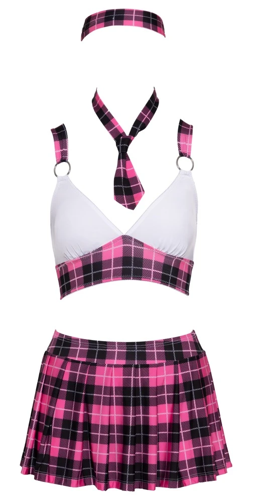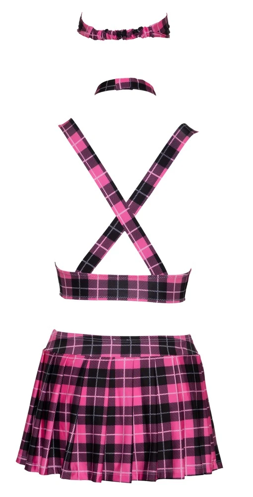 • Schnitt & Material: Hochwertiges 4-teiliges Schuluniform-Kostüm im pink/schwarz/weißen Karo-Look. Bestehend aus Top, Faltenröckchen, Krawatte und Haarband. Top mit weißen Cups und Ringen für die breiten Träger, die im Rücken über Kreuz verlaufen. Extra kurzes Röckchen mit bequemem Stretchbund. 95% Polyester, 5% Elasthan.