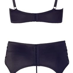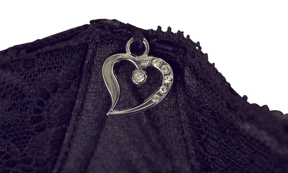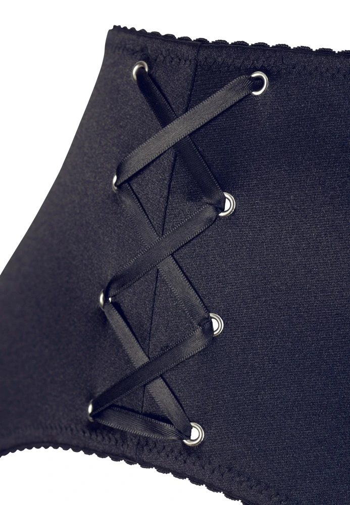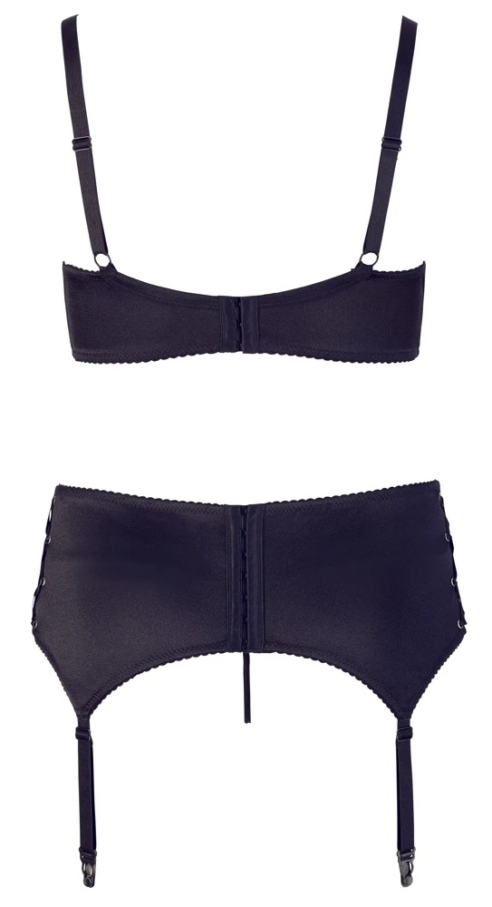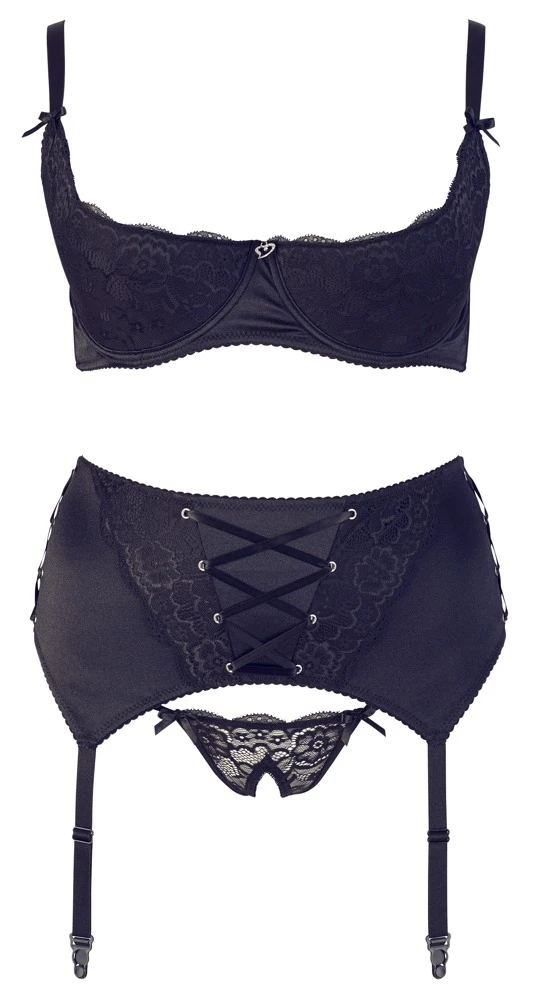 • Schnitt & Material: Schwarzes Straps-Set bestehend aus leicht gefütterter Hebe mit zarter Spitze an den Cups, Strapsgurt mit Zierschnürung vorne und seitlich sowie String ouvert aus Spitze. Träger und Strapse verstellbar. 90% Polyamid, 10% Elasthan.