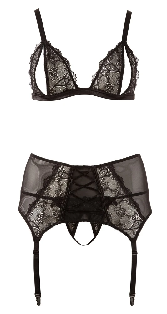 Bildschönes Set aus schwarzer Blütenspitze. Soft-BH mit offenen Cups, verstellbaren Trägern und Hakenverschluss hinten. Strapsgürtel mit raffinierten Zierschnürungen und vier verstellbaren Strapsen. Dazu passender String.