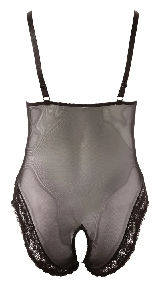 • Schnitt & Material: Body ouvert aus semitransparentem Powernet mit verstellbaren Trägern. Mit Blütenspitze an den Cups, spitz auslaufend in Richtung Körpermitte. Beinabschüsse vorne und hinten ebenfalls mit Blütenspitze. 90% Polyamid, 10% Elasthan.