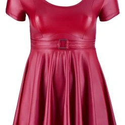 Schnitt & Material: Minikleid mit Rundhals, kurzem Arm und ausgestelltem, schwingendem Rock. Eingearbeiteter Gürtel in der Taille, vorne mit Zierschnalle. 85% Polyester, 15% Elasthan.