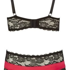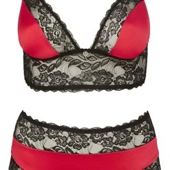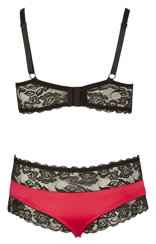 Dieses raffiniert geschnittene Set setzt Deine Kurven perfekt in Szene und besticht mit seinem edlem Materialmix aus rotem Stretchsatin und schwarzer Blütenspitze. Mit angenehm breiten Trägern, die auch bei großen Brüsten nicht unangenehm einschneiden und in angesagter Longline-Optik. Der dazugehörige String streckt optisch Deine Taille und macht Deinen sexy Look perfekt. Für verführerische Frauen, die wissen, was Sie wollen.