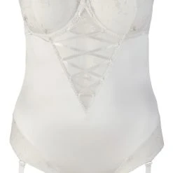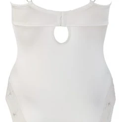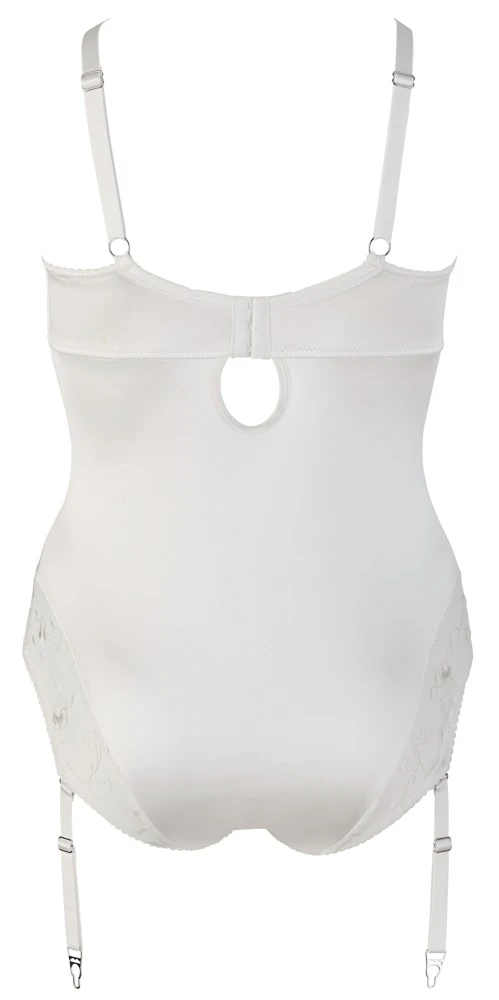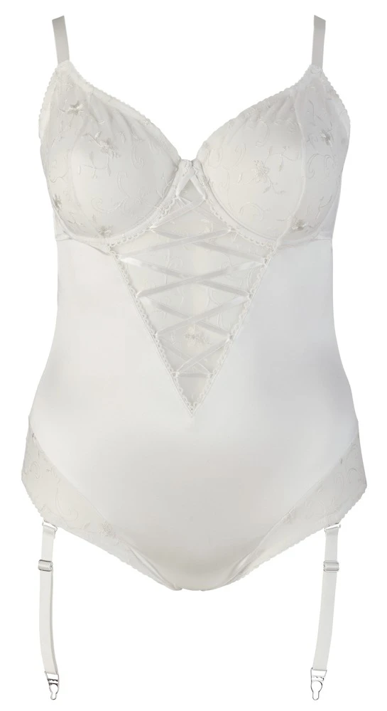âą Schnitt & Material: WeiĂer BĂŒgel-Body mit abnehmbaren Strapsen. Extra breite TrĂ€ger und Druckknopf-Verschluss im Schritt. Mit Einsatz aus besticktem TĂŒll vorne und an den BeinabschlĂŒssen. Hakenverschluss hinten. TrĂ€ger und Strapse verstellbar. 90% Polyamid, 10% Elasthan; bestickter TĂŒll 100% Polyester.