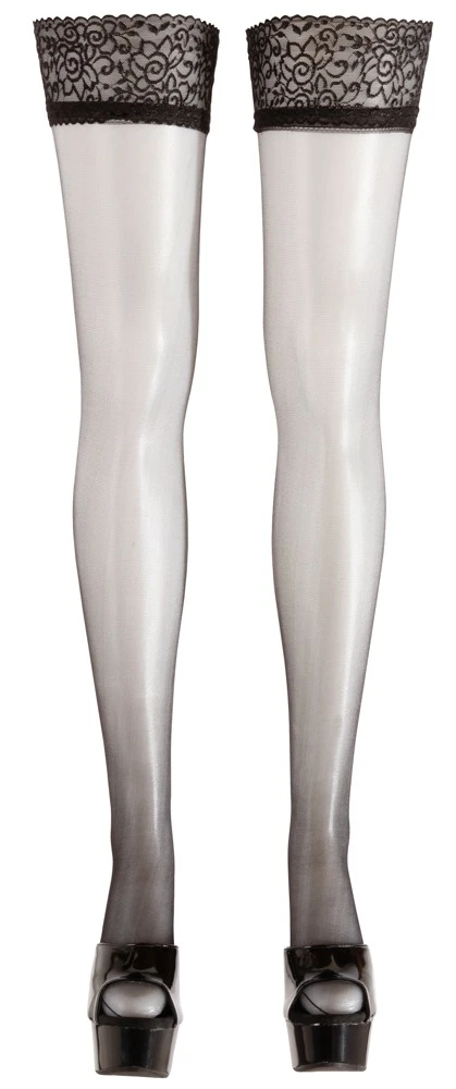 • Schnitt & Material: Halterlose Strümpfe mit Spitzenabschluss. Silikonband innen. Oeko-Tex zertifiziert. 90% Polyamid, 10% Elasthan.