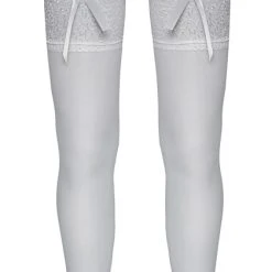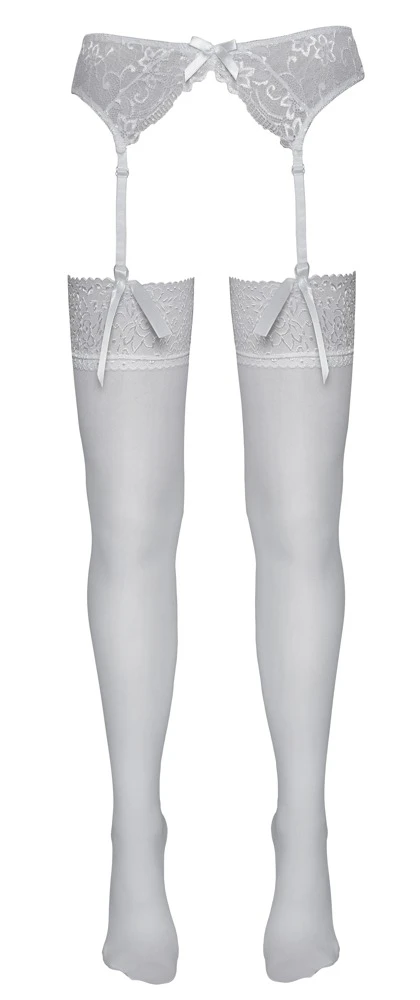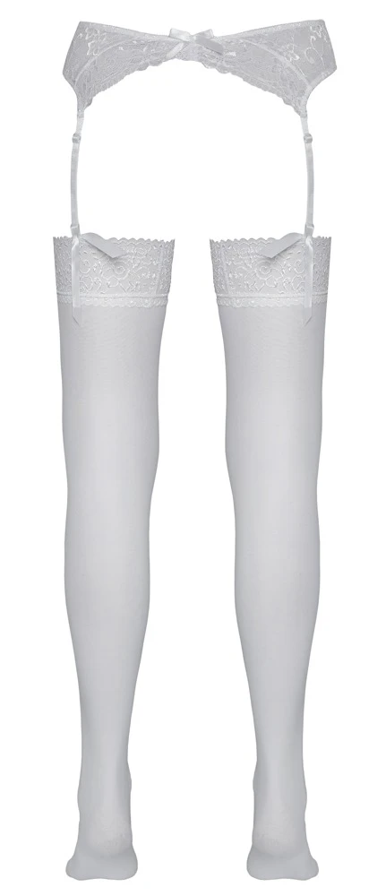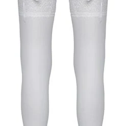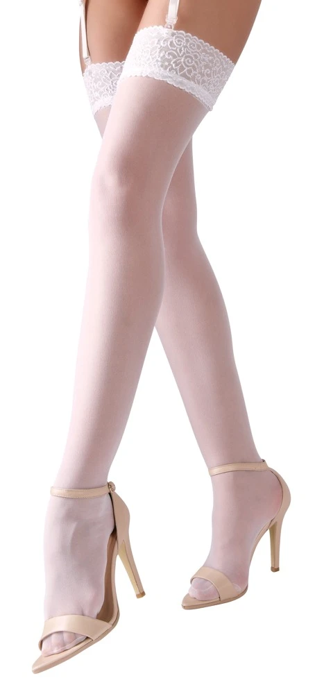 • Schnitt & Material: Weiße Straps-Strümpfe mit 7 cm breiter Blütenspitze am oberen Rand. 20den. Oeko-Tex zertifiziert. 95% Polyamid, 5% Elasthan.