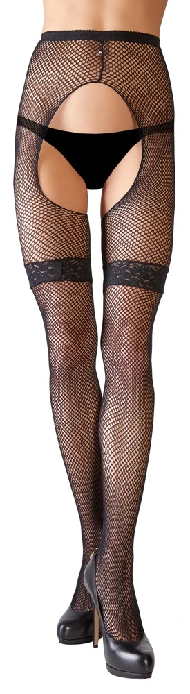 • Schnitt & Material: Straps-Strumpfhose ouvert aus grobem Netzmaterial. Eingenähte Strumpfbänder aus Spitze. 90% Polyamid, 10% Elasthan.