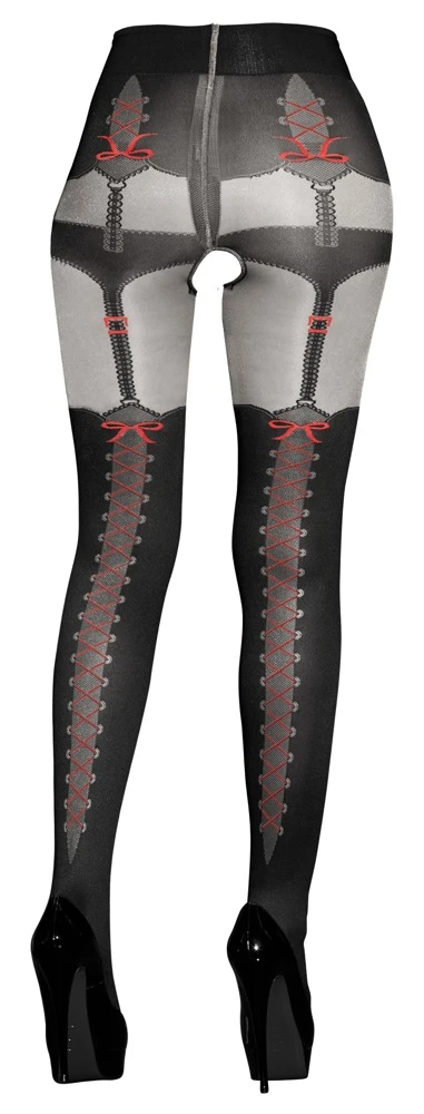 • Schnitt & Material: Straps-Strumpfhose ouvert mit eingewebten Höschen, Strapse und Overknees. Akzentuiert mit Schnür-Optik. 89% Polyamid, 9% Elasthan, 2% Polyprophylen.
