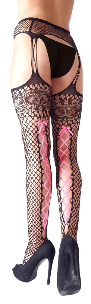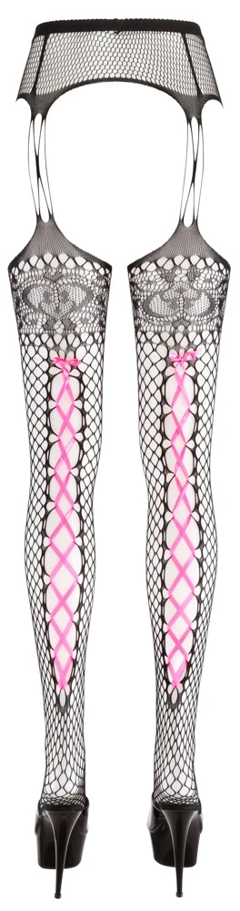 • Schnitt & Material: Straps-Strumpfhose in Strapsgurt-Optik. Grobes Netzmaterial. Pinke Zierschnürung hinten. 90% Polyamid, 10% Elasthan.