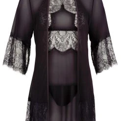 • Schnitt & Material: 3-teiliges Set bestehend aus Negligé, Kimono und String. Das Negligé ist aus Powernet gearbeitet mit großflächigem Einsatz aus Eyelash-Spitze in der Front und kleinerem Spitzen-Einsatz unterhalb des freien Rückens. Im Nacken ist das Negligé mittels Neckholder zu binden. Der passende Kimono mit halben Armen und Satin-Bindegürtel besteht ebenfalls aus Powernet mit breiten Armabschlüssen und breitem Saum aus Eyelash-Spitze. Der beiliegende Powernet-String verfügt über einen Baumwoll-Zwickel. 94% Polyamid, 6% Elasthan.