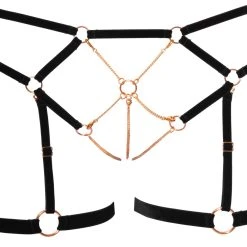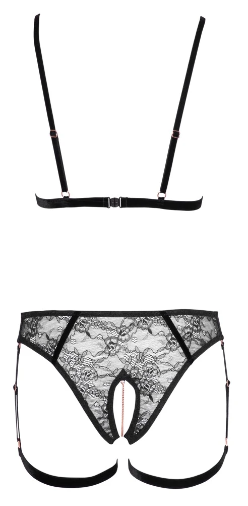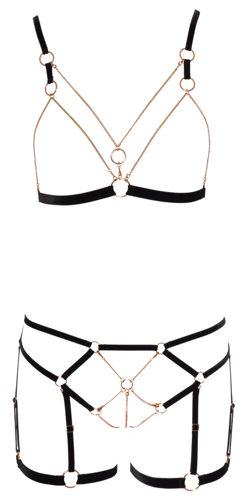 âą Schnitt & Material: Busenfreier Soft-BH und Slip ouvert aus elastischen SamtbĂ€ndern und rosĂ©goldfarbenen Ketten mit Ringen. Slip ĂŒber dem Po komplett aus elastischer Spitze gearbeitet. BH hinten mit Hakenverschluss, TrĂ€ger verstellbar. Die Ketten mit Karabinerhaken sind vom BH teilweise und vom Slip komplett abnehmbar, genauso wie die verstellbaren Schenkelriemen. 100% Polyamid; Spitze 90% Polyamid, 10% Elasthan.