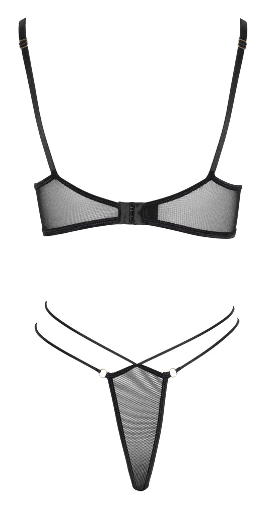 • Schnitt & Material: BH und Rio-String aus elastischem Powernet mit edlen Stickerei-Applikationen an den Cups und an der String-Front, sowie goldfarbenen Ring-Details. BH mit verstellbaren Trägern und Hakenverschluss im Rücken. Rio-String mit doppeltem Stretchband-Bund. 90% Polyamid, 10% Elasthan.