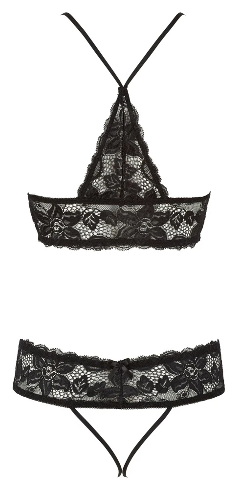 • Schnitt & Material: Bralette aus weicher Blütenspitze mit aufknöpfbaren Cups und aufwendigem Racerback im Rücken. Dazu passender String mit breitem Spitzenbund. Komplett offener Schritt, bei dem der Venushügel von zwei elastischen Bändern eingerahmt wird. 90% Polyamid, 10% Elasthan.