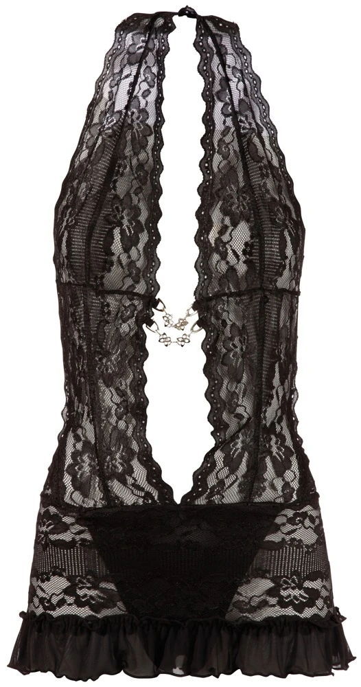 âą Schnitt & Material: Kleid aus floraler Spitze. Neckholder. Tiefer Ausschnitt, der in der Front mit 2 Zierketten. RĂŒcken komplett frei. Inklusive eingenĂ€htem String ouvert. Ănderung der Spitze vorbehalten. 94% Polyamid, 6% Polyester.
