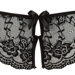 • Schnitt & Material: Aufwendig gearbeiteter Slip aus schwarzer Blütenspitze. Mit offenem Schritt und schleifenverzierten Cut-outs vorne und hinten. 90% Polyamid, 10% Elasthan.